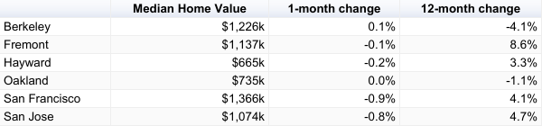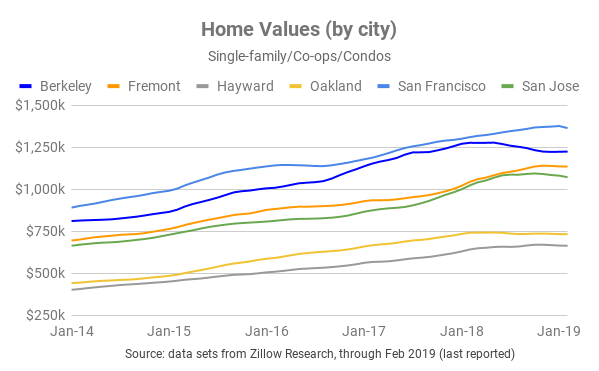 If we look at changes in home values over a twelve month period (through February 2019), we see decent performance in all but Berkeley and Oakland.