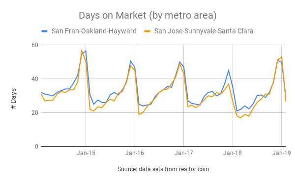 The average home in both the San Francisco-Oakland-Hayward metro and the San Jose-Sunnyvale-Santa Clara metro takes just under 30 days to sell. At the moment, it is not uncommon for the most desirable properties in San Francisco/East Bay to sell in just two weeks. Nationally, the average home is on the market for 63 days.