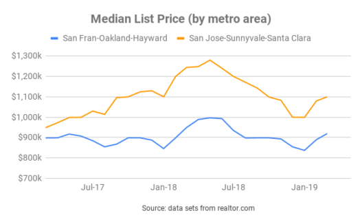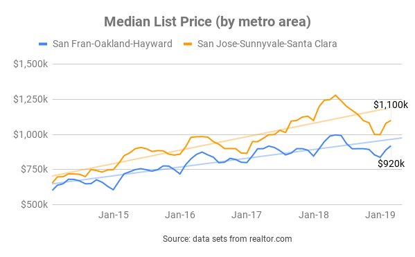 After peaking in the middle of 2018, prices declined through year end. Median list prices in both the San Francisco-Oakland-Hayward metro and the San Jose-Sunnyvale-Santa Clara metro have increased by 10% since the start of 2019.