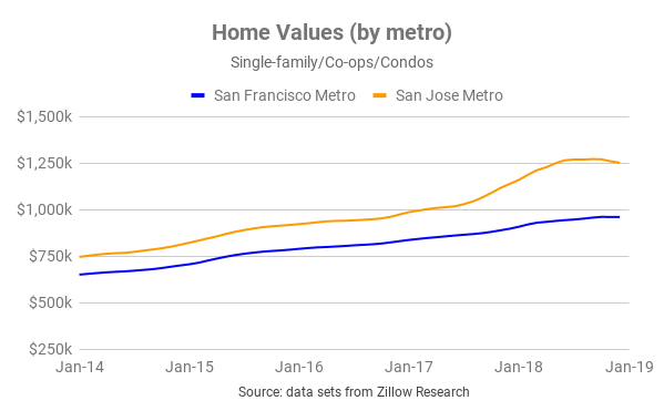 So while it’s true that Median List Prices dropped in the second half of 2018 (and in January 2019), this hardly paints an accurate picture of price action. Bay Area Home Values have trended upwards.