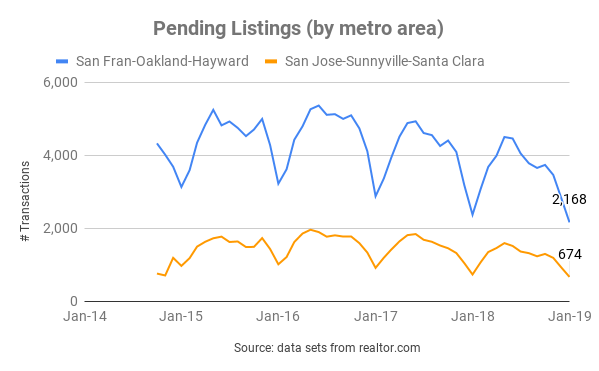 The Median List Price for a home in the San Francisco-Oakland-Hayward Metropolitan Area shot up 18% in the first five months of last year, with similar gains seen in the San Jose-Sunnyville-Santa Clara Metro. From June onwards, however, the Median List Price in both Metros began a steady decline that saw these gains erased on a year-on-year basis. In January 2019, we saw the Median List Price in the SF Metro drop by 2% with no month-on-month change in the SJ Metro.