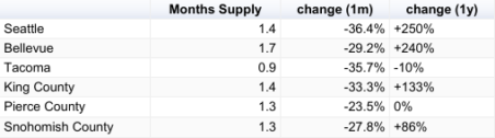 Months supply of inventory - the number of months it would take for all existing inventory to be taken down if no new homes came to market - is now looking fairly skinny across Greater Seattle.