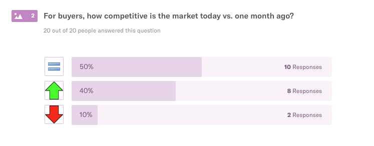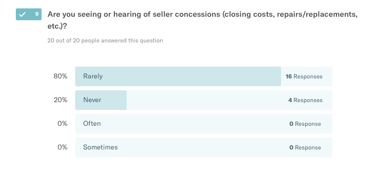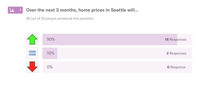 We surveyed 20 top real estate pros from our network of agents, loan officers, and builders in and around Seattle to get the skinny on what’s going down in the Seattle housing market. Data is a funny thing – often sliced, diced, and compiled to suit a purpose. Our goal is simple: ask people who are well-positioned in the market what they’re seeing. We asked 10 multiple choice questions + 1 open-ended question, and we’ll do the same next month.